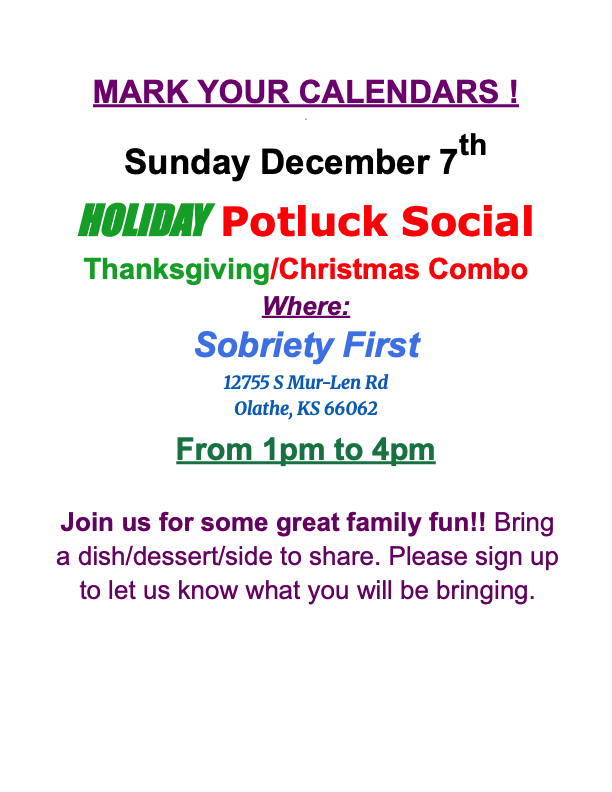 Sobriety First Potluck Social Sunday December 7th 1-4pm